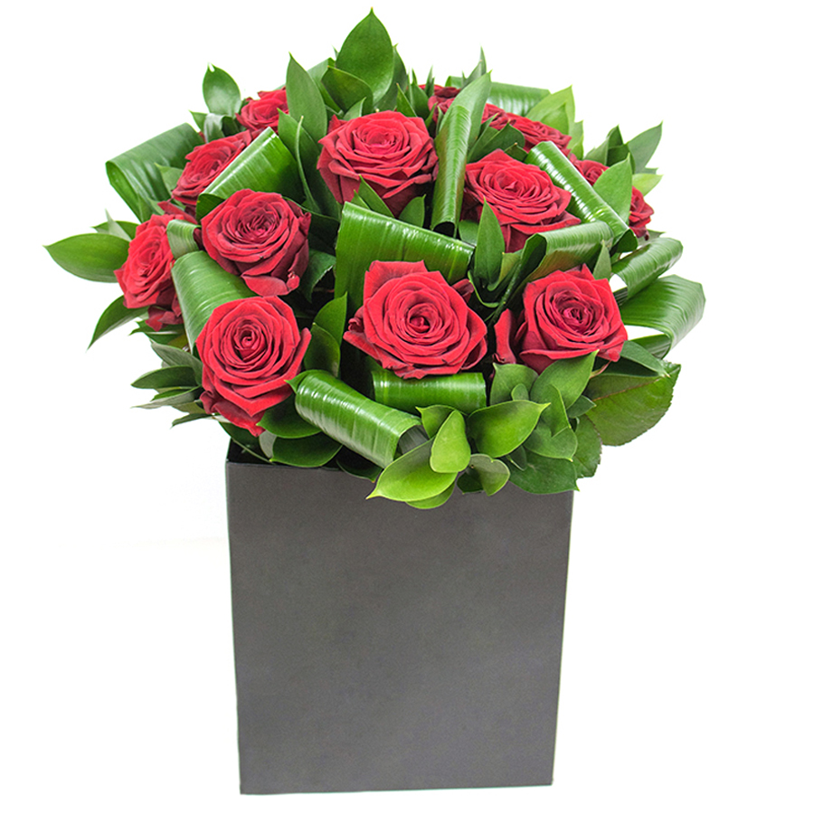 Enhance your home with our elegant bouquet, designed to bring sophistication and beauty to any room. This extraordinary arrangement combines vibrant red roses with lush aspidistra leaves and delicate ruscus, creating a harmonious and eye-catching display.